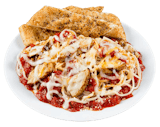Spaghetti topped with Chicken, Parmesan Cheese, and our Signature Cheese Blend with Your Choice of House Made Meat Sauce, Vegetarian Sauce or Alfredo Sauce. Served with an 8" Garlic Breadstick.