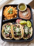 Corn tortilla tacos filled with your choice of meat topped with cilantro onion & cheese. Rice, beans & green salsa on the side.