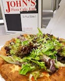 Spring mix with spinach. Simply astounding. A hand-tossed pizza with John's dill sauce, fresh arugula, fresh spinach, red bell peppers, mozzarella, and ricotta cheese topped with spring mix.