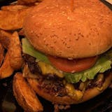 Vegan, gluten-free. Served on a gluten-free bun, topped with lettuce, tomatoes, onion, pickles, ketchup, and mustard.