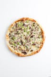 Mozzarella, alfredo sauce, steak, mushrooms, green peppers & red onions.