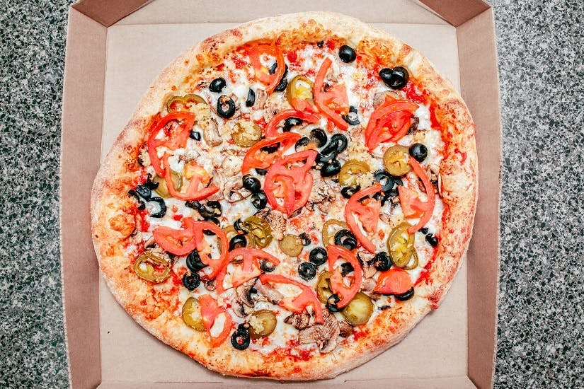 Artichokes, onions, mushrooms, black olives, tomatoes, jalapeños, feta & oregano.