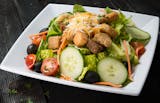 Tomatoes, cucumbers, onions, olives, and feta cheese in an olive oil dressing.