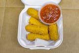 Zucchini sticks dipped in an egg mixture with bread crumbs, parmesan cheese, baking powder, & salt, fried until golden brown.