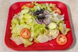 Crispy greens, grape tomatoes, cucumbers, feta cheese, onions, olives, green peppers, pepperoncini, and hard boiled egg.