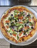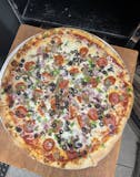 Pepperoni, beef, sausage, mushrooms, green peppers, black olives, onions, and mozzarella cheese.