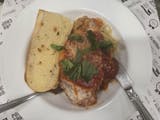 Chicken cutlet, marinara, parmesan, mozzarella melted, fresh basil, spaghetti.