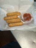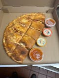 Marinara sauce, Parmesan cheese, and provolone cheese served with piece of garlic bread