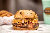 Natural raised Buffalo meat marinated in chipotle seasoning topped with crispy onion straws, Cheddar cheese, lettuce, tomato, and mayonnaise on a fresh baked deli bun.