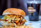 Boneless chicken breast, Bull's eye BBQ sauce, Cheddar, crispy onion straws, lettuce, tomato, and mayonnaise on a fresh baked deli bun.