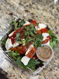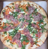Fresh tomato & fresh mozzarella topped with arugula & prosciutto.