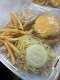 Ground sirloin, cheese, lettuce, onion, pickles, sesame seeds & special sauce.