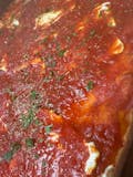 Eggplant with dollops of ricotta cheese, sauce, romano & mozzarella.