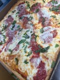 Square pizza, pomodoro sauce, mozzarella & provolone sprinkled with Romano cheese and fresh basil