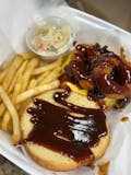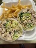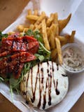 Chicken strips, fries, cheddar cheese lettuce, tomato & BBQ sauce.