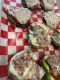 stuffed pepper with ground beef, vegetables, topped with mozzarella cheese.