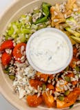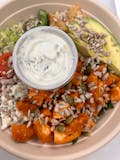 Fried Chicken Tenderloins, Roasted Cauliflower, Celery, Marinated Cherry Tomatoes, Seed Mix, Blue Cheese Crumbles, Hot Sauce served over Jasmine Rice & our greens mix