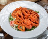 Buffalo calamari, arugula with tomato, crumbled blue chese, and served with blue cheese dressing.