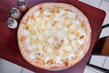 A sauceless pie topped with ricotta, mozzarella, and parmesan cheese.