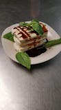 A sauceless pie topped with ricotta, mozzarella, and parmesan cheese.