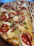 A flavorful pizza topped with sliced plum tomatoes fresh mozzarella, sweet basil,drizzle with extra virgin olive oil