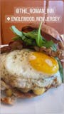Arugula, onion, tomato, bacon, sunny side up egg on French toast roll & home fries.