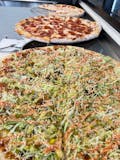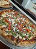 House made pizza sauce,Buffalo chicken, scallions, ranch dressing drizzled