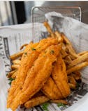 Red velvet waffle, fried chicken wings, fresh fruit, syrup & powdered sugar.