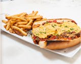Thinly sliced hot roast beef, Swiss cheese, ajou, crispy onions on top. Served with fries