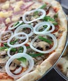 Pepperoni, sausage, mushrooms, green peppers, onions.