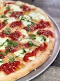 Thin crust, chunky, tomato sauce, fresh mozzarella & basil.