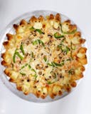 A sauceless pie topped with mozzarella, and parmesan cheese.