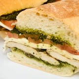 Fresh mozzarella, tomatoes & pesto (nut-free) on a thin Sicilian pan crust.