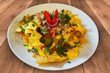 Scrambled eggs, chorizo sausage, pickled jalapenos, onions, green peppers & cheddar and jack cheeses, served with home fries, chunky salsa, and sour cream.