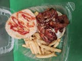 Cheesesteak, chicken fingers, mozzarella sticks, French fries, and marinara sauce.