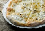 A sauceless pie topped with ricotta, mozzarella, and parmesan cheese.