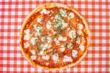 Tomato sauce, fresh mozzarella, basil, garlic, and drizzled with EVOO.