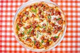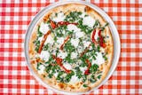 Your choice of a plain pie or white pie, topped with roasted zucchini, garlic, mushrooms, roasted peppers, tomatoes, and broccoli.