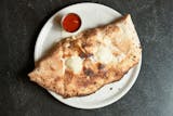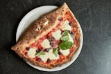 Half Margherita with kalamata olives and half calzone with ricotta, mozzarella, crumbled woodfired sausage, and roasted peppers.