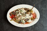 Grilled eggplant, roasted peppers, red onion, mushrooms, shredded mozzarella, sauce.