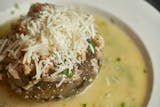 Ditalini, Parmesan cream sauce, Gruyere and cheddar cheese, shredded mozzarella and shrimp topped with toasted bread crumbs.