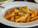 Rigatoni, prosciutto, and shallots in a light pink cream sauce.