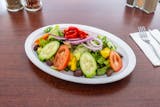 A mix of romaine lettuce, red leaf lettuce, tomatoes, Bermuda onions, Kalamata olives, cucumbers & pepperoncini peppers.