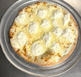 A sauceless pie topped with ricotta, mozzarella, and parmesan cheese.
