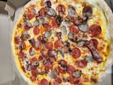 A robust gathering of classic red sauce mozzarella parmesan, sausage, pepperoni, red onions, mushrooms, and peppers.
