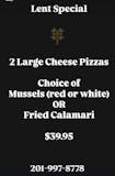 Two Large Cheese Pizzas, Mussels (Red or White) or Fried Calamari