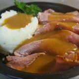 Shaved oven Roasted beef simmered in rich gravy over thick sourdough, served with fries or Yukon Gold Mashed potato.