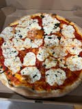 Topped with tomato sauce, fresh mozzarella, fresh garlic, mozzarella, basil, oregano, parmesan cheese & olive oil.