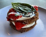 hand battered and fried eggplant, fresh mozzarella, marinated roasted peppers and balsamic drizzle