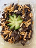 Rice, chicken peas, pasta, topped with fried onions, and red vinegar garlic sauce.